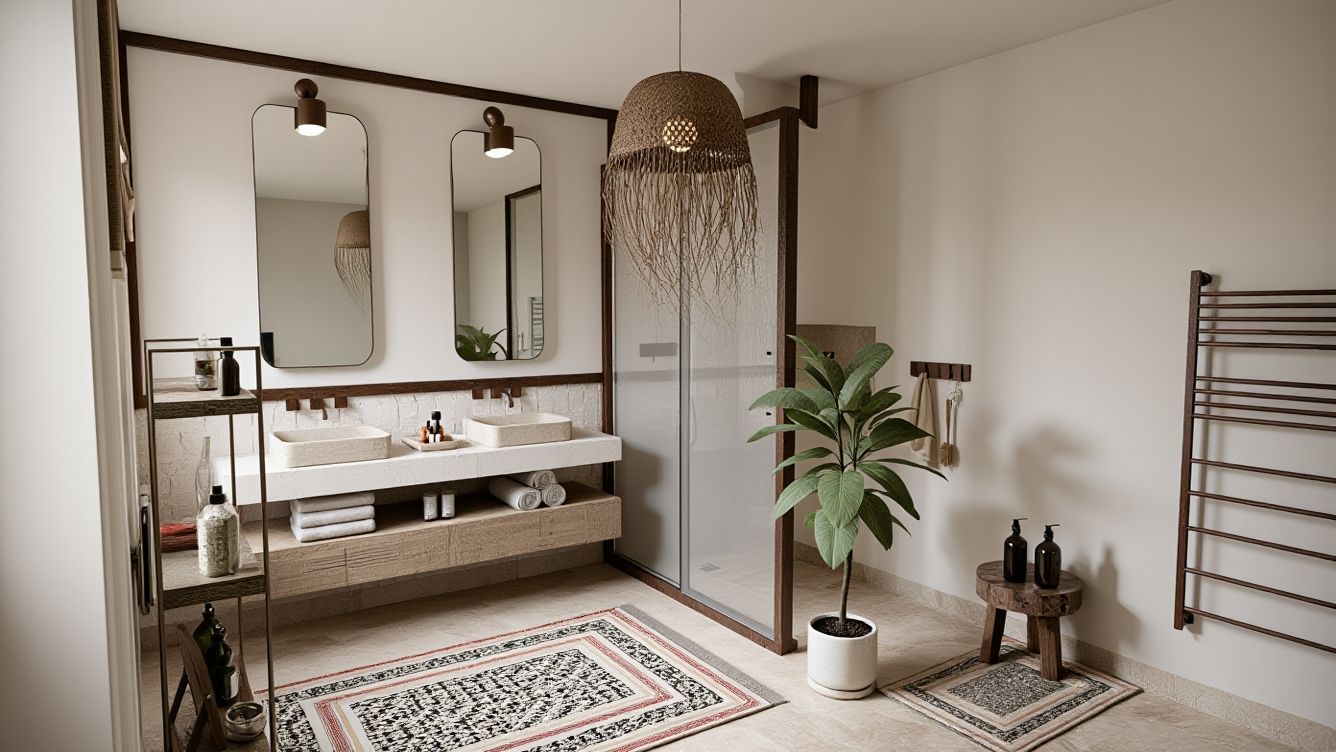 Salle de bain épurée associant pierre et bois, créant une atmosphère zen et apaisante.Un espace pour le calme et l’équilibre.